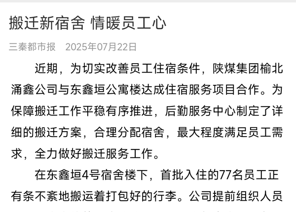 三秦都市報丨榆北涌鑫公司:搬遷新宿舍 情暖員工心