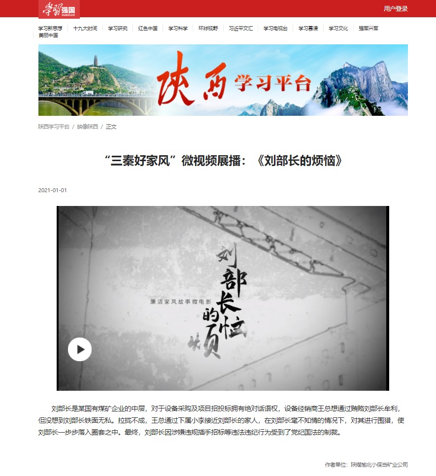 學(xué)習強國、國企清風等多家知名媒體爭相展播公司廉潔微電影《劉部長的煩惱》